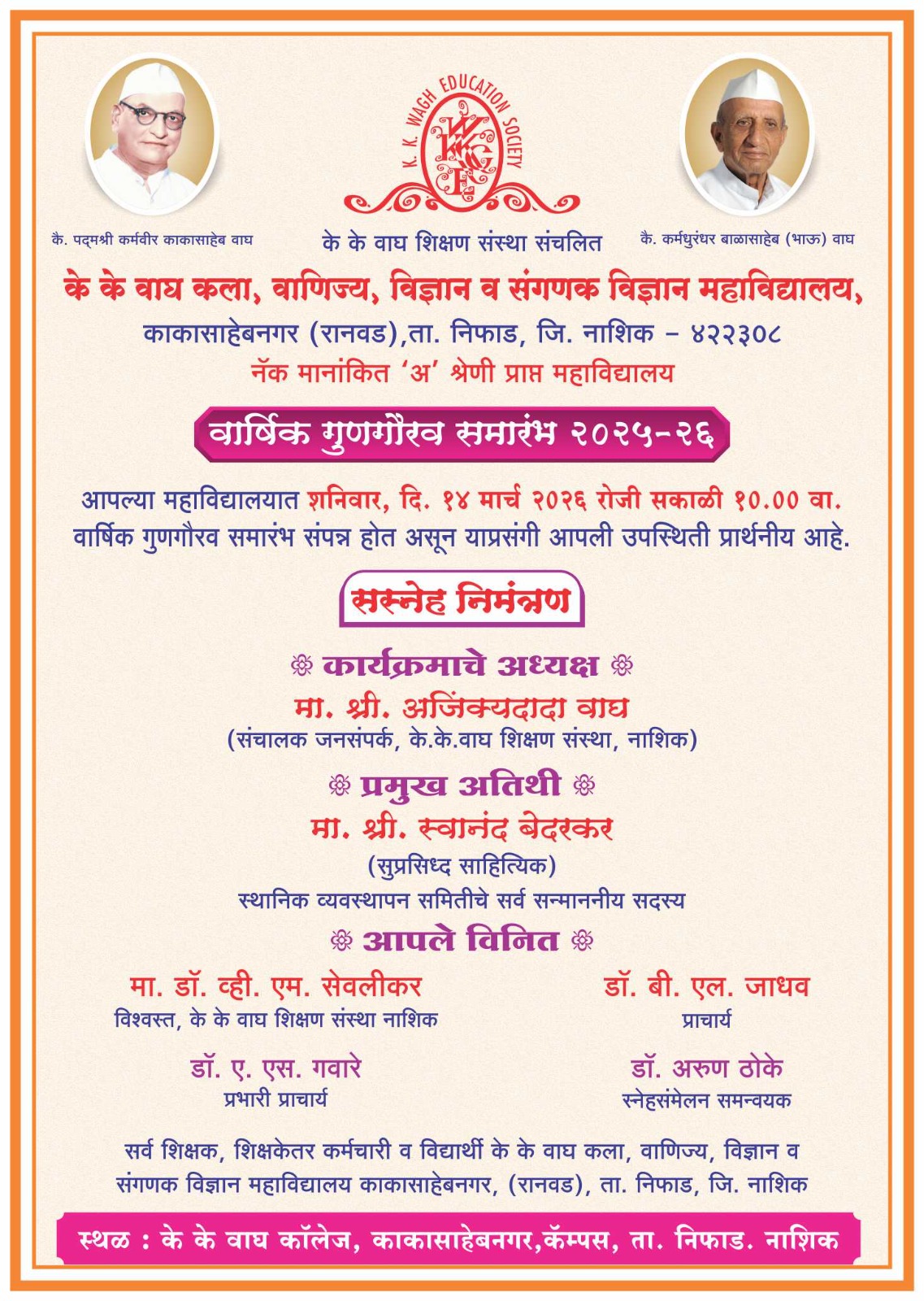 The K. K. Wagh Arts, Commerce, Science and Computer Science College (popularly known as K. K. Wagh Senior College, Kakasaheb Nagar) was established in July 2004. The College has its own building. The College offers degree courses in various faculties viz. Arts, Commerce, Science and Computer Science. The college has earned name and fame for its academic excellence, punctuality, high standard of discipline and administration. The College has well-equipped laboratories in every faculty and enriched library with variety of reference books, Journals, Magazines & Newspapers. Apart from various curricular activities, the college provides facilities for extra-curricular activities like Student Council, NSS, Sports, Earn and Learn Scheme, Personality development programs, Competitive Exam Cell and Forum Activities in every faculty. The College has good ambience helping in overall development of students. The management gives overwhelming support for the development of the college.